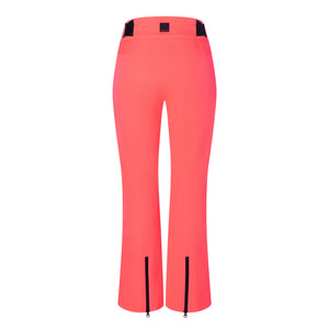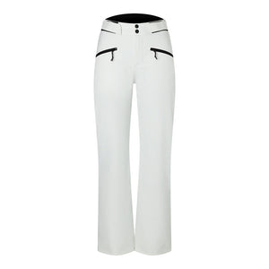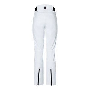 Straight cut featuring fastens with a zip, two FIRE+ICE press studs and hooks, waistband slightly raised and padded at the back, adjustable width with side Velcro fasteners and elasticated tapes, two zipped side pockets, snow skirt with elasticated hem, underlaid zip