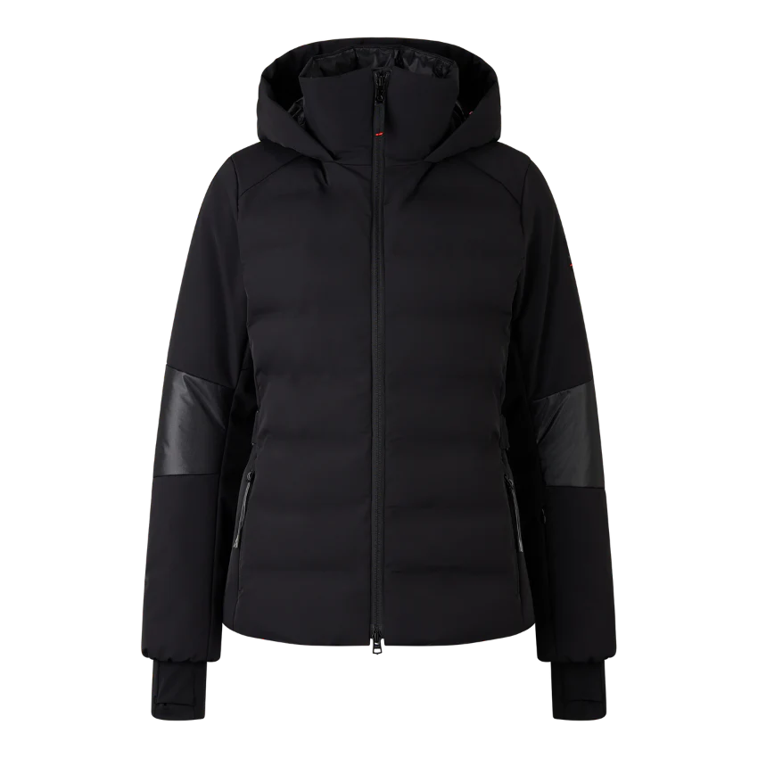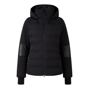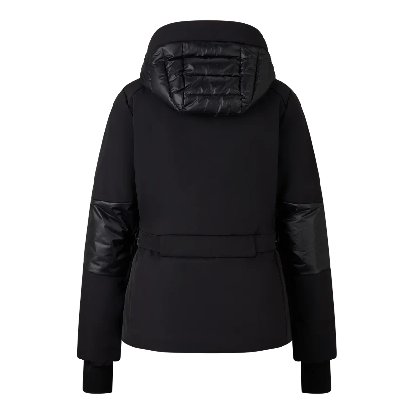 Ski jacket in a regular fit in a design mix of quilted and smooth sections featuring padded stand-up collar, fixed hood with drawstring and stopper, long sleeves, elasticated cuffs with inserted thumb loop, underlaid two-way zip with B pendant, one seam-covered