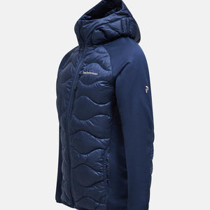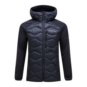 Chinguard, Duck down, 700 fill power, 90/10 down/feather, Elastic binding at bottom hem, Elastic cuffs, Full front with reversed YKK coil zipper, Hanger loop outside neck, Hood with drawcord adjuster, Hybrid, Jersey panels, Lightweight, 42 gsm 20D ripstop. Windproof and repels light rain, Made without intentionally added PFAS, Midweight, 271 gsm flat fleece, soft brushed back that traps warm air. Dries quickly, Open hand pockets, P-logo embroidery at sleeve, Peak Performance embroidery at chest, Quilted in our iconic Helium pattern, Responsible down standard, Side panels in polyester jersey, Soft, midweight polyester fleece with brushed back, Sterilization Permit no. PA 9900(CN), Ultralight nylon ripstop, wind and water resistant, Zippered chest pocket