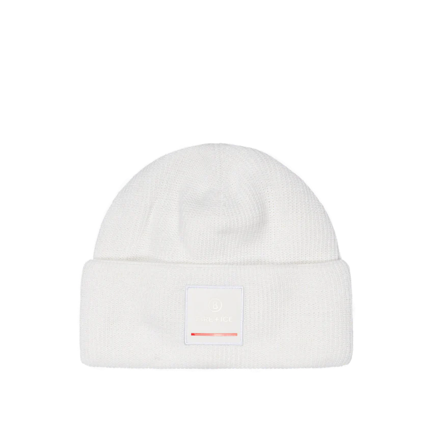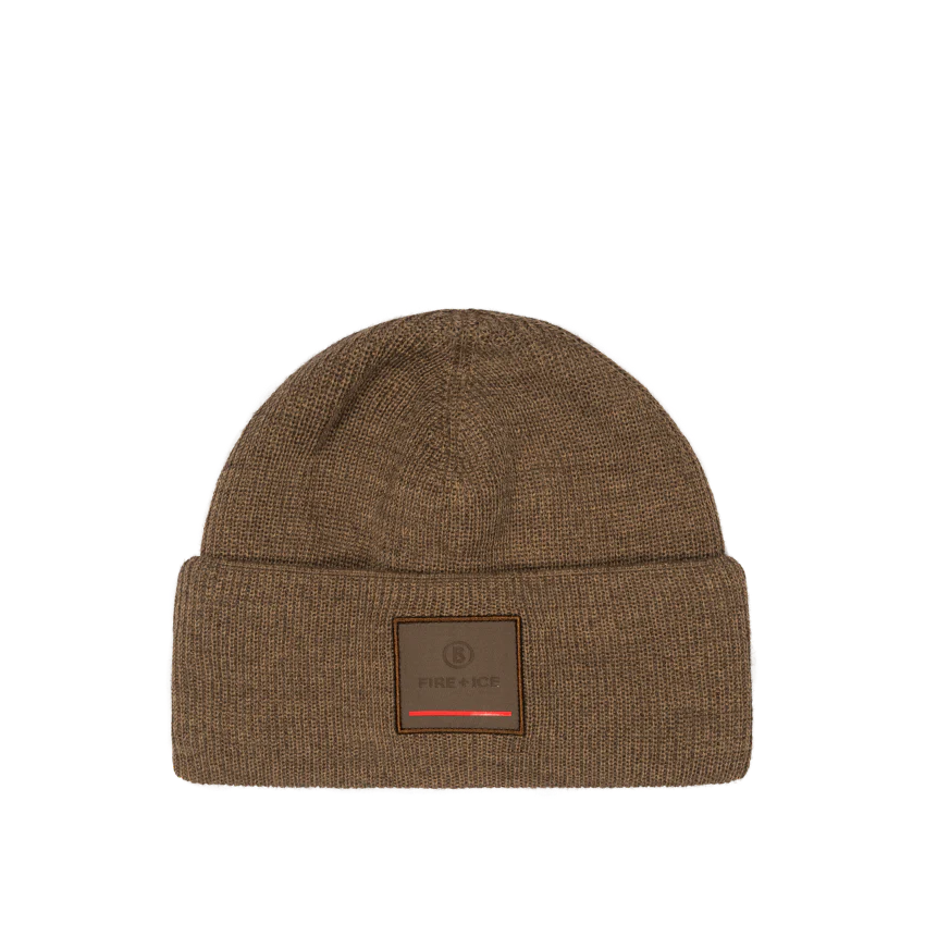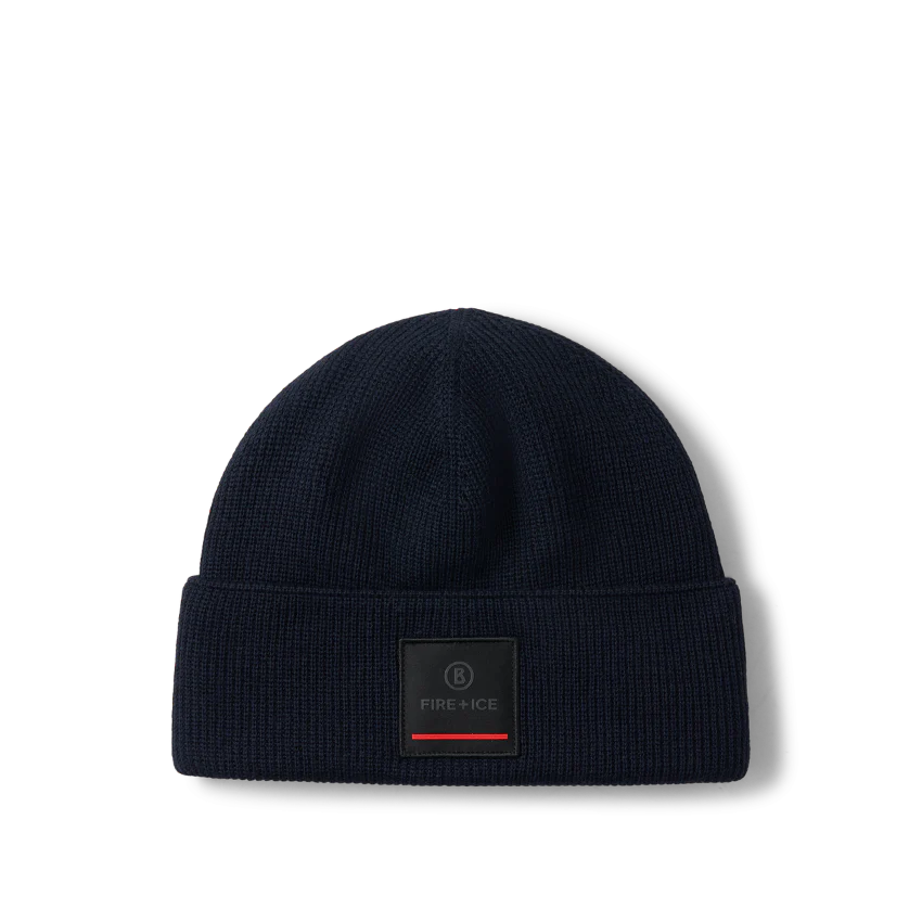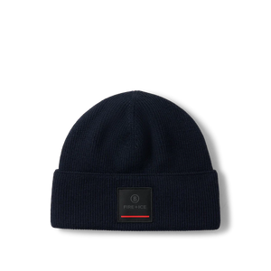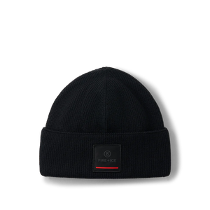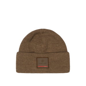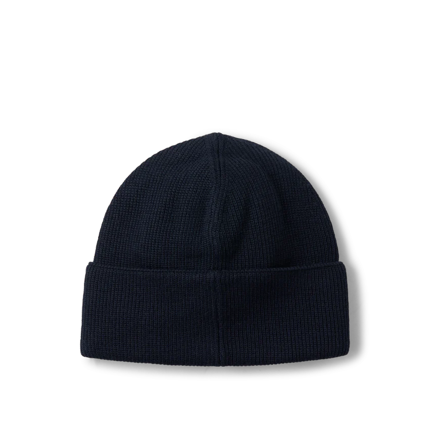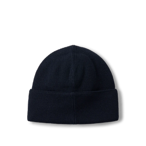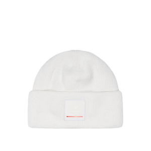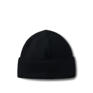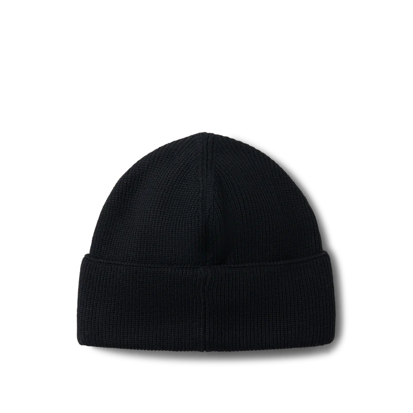 Hat in soft rib knit featuring with wide turn-up Appliquéd label badge Shaping seams Unisex design