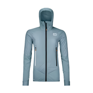 Strenuous ski touring ascents in bitter cold: The SwisswoolCOL BECCHEI HYBRID JACKET for women offers optimal protection with maximum freedom of movement.